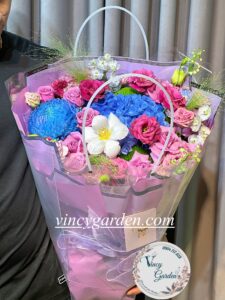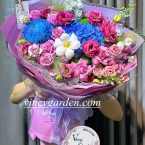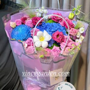 Bó hoa này là sự kết hợp tuyệt vời của những bông cẩm tú cầu xanh mát dịu, cúc mẫu đơn xanh tươi tắn và hoa hồng tím sang trọng. Mỗi bông hoa được chọn lọc cẩn thận, tạo nên một tổng thể hài hòa và thanh lịch. Màu xanh của cẩm tú cầu và cúc mẫu đơn tượng trưng cho sự tươi mới và hy vọng, trong khi sắc tím của hoa hồng mang đến vẻ đẹp quý phái và sâu lắng.
