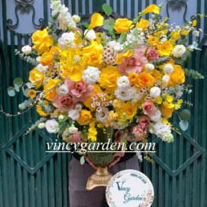 Nhân dịp đặc biệt, không gì thể hiện lòng tri ân và sự kính trọng tốt hơn một bình hoa chúc mừng sang trọng, tông màu vàng nâu đầy ấm áp và quý phái.
