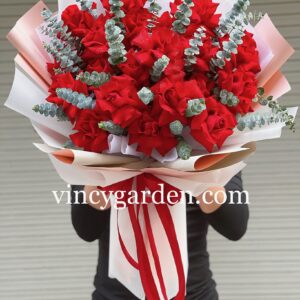 Được tạo nên bởi 20 bông hồng nhập khẩu màu đỏ rực rỡ tươi thắm, kết hợp cùng lá bạc, giấy gói hoa Hàn Quốc và nơ lụa xịn, bó hoa hồng tươi thắm trao gửi tới người thương thông điệp tình yêu và may mắn.