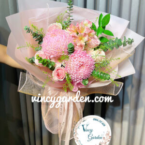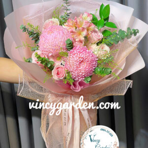 Một bó hoa màu hồng ngọt ngào được mix giữa những loại hoa xinh đẹp tạo nên một khu vườn hoa thơ mộng, xinh tươi.
