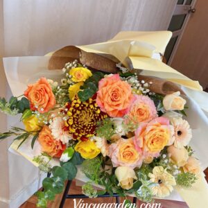 Một bó hoa tone cam xinh xắn kết hợp với vải lưới cao cấp màu cam tạo nên một bó hoa tuyệt đẹp, ấm áp, sang trọng, tặng mẹ yêu hay ai khác đều phù hợp.