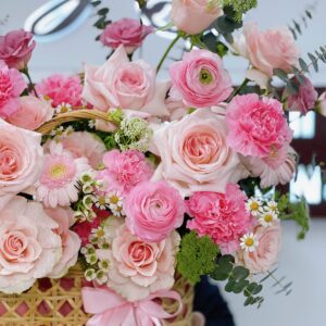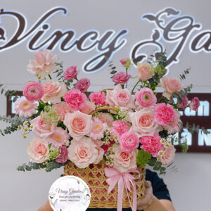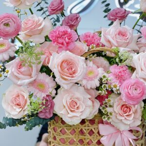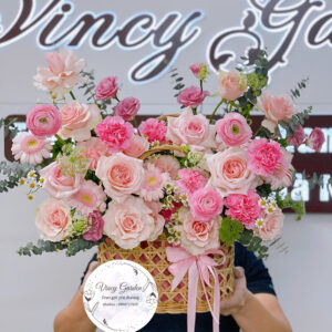 💐 Giỏ hoa gam màu hồng nhẹ nhàng và dễ thương với điểm nhấn là hoa hồng ohara nhập khẩu, hồng kem dâu,hoa mao lương hồng và phăng hồng phớt….. Được tô và điểm nhẹ một chút bay bổng của thanh liễu, hoa cúc tana và bông tuyết.