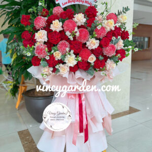 Chiếc kệ hoa khai trương lộng lẫy màu đỏ hồng như một nàng công chúa kiêu sa nổi bật giữa đám đông. Kệ hoa hồng ngọt ngào được mix những loại hoa tươi xinh nhập khẩu.Cây hoa hồng chân công chúa sang chảnh sẽ làm cho buổi lễ khai trương thêm phần cuốn hút, nổi bật thu hút sự chú ý của các quan khách, tạo điểm nhấn cho không gian của bạn