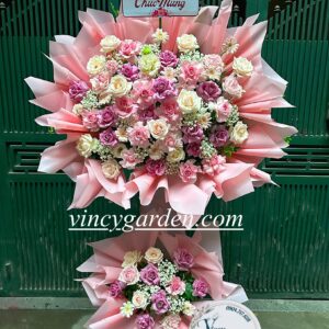 Kệ hoa màu hồng không chỉ đẹp mà còn rất nổi bật, giúp tạo điểm nhấn cho không gian buổi lễ khai trương. Sắc hồng tươi sáng thu hút ánh nhìn và mang lại không khí vui tươi, phấn khởi.