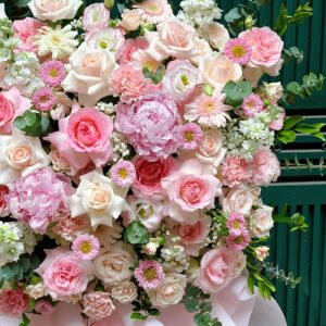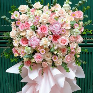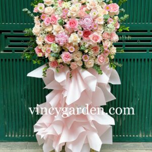 Chiếc kệ hoa khai trương lộng lẫy màu hồng như một nàng công chúa kiêu sa nổi bật giữa đám đông. Kệ hoa hồng ngọt ngào được mix những loại hoa tươi xinh nhập khẩu :