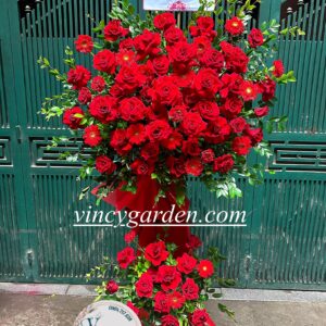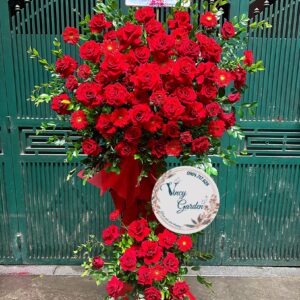 Kệ hoa khai trương rực rỡ với sắc đỏ tươi thắm, biểu tượng của may mắn, thịnh vượng và thành công! Kệ hoa này là sự kết hợp hoàn hảo của những bông hoa hồng đỏ sang trọng, hoa đồng tiền đỏ may mắn, và những cành hoa phụ tinh tế, tạo nên một không gian ngập tràn năng lượng và sự phấn khởi.