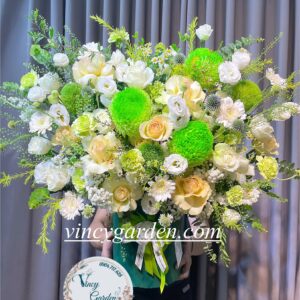 Vincy chúng mình giới thiệu đến bạn giỏ hoa chúc mừng màu xanh lá, mang đến sự tươi mới và cảm giác bình yên. Giỏ hoa này là biểu tượng của sự phát triển, hy vọng và sức sống, là món quà hoàn hảo để gửi đi những lời chúc tốt đẹp nhất.